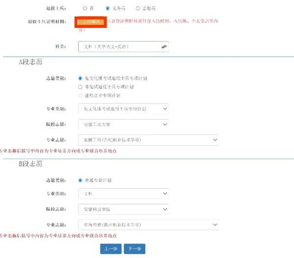 8.志愿分为A段和B段,每段均设置1个院校志愿和1个专业志愿。其中A段为专项计划志愿,含免文化课考试退役士兵专项计划、非免试退役士兵专项计划和建档立卡考生专项计划。B段为非专项计划志愿。符合条件的考生可兼报A段、B段志愿。符合文化课免试条件且填报B段非专项计划志愿的退役士兵须参加公共课和专业课考试。