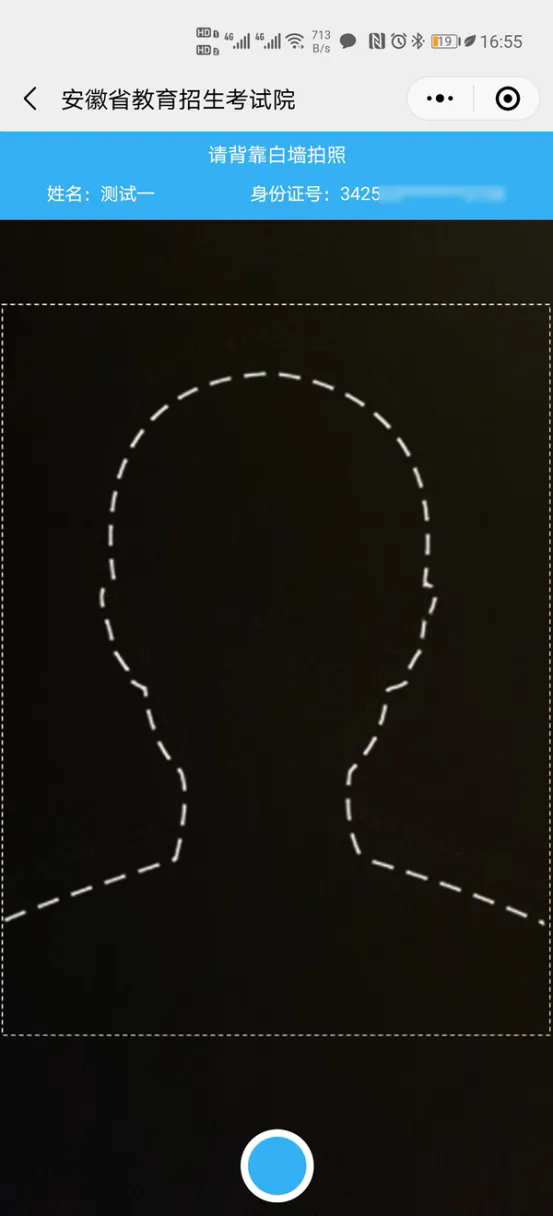 确保脸部充满整个虚线框,手机摄像头与眼睛在同一水平线,不仰头,不低头。