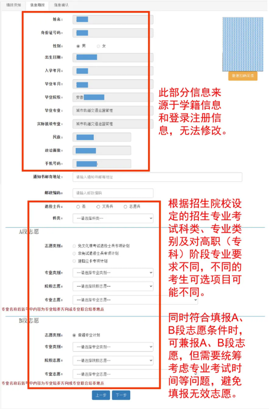在充分阅读招生院校《招生章程》,了解院校招生要求后,根据自身情况,填写邮寄地址、邮政编码,选择自己报考的科类、院校志愿和专业志愿。