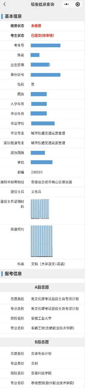 信息提交后,等待毕业院校审核,请随时关注微信小程序或者使用浏览器登录zsbbm.ahzsks.cn查看自己的状态。