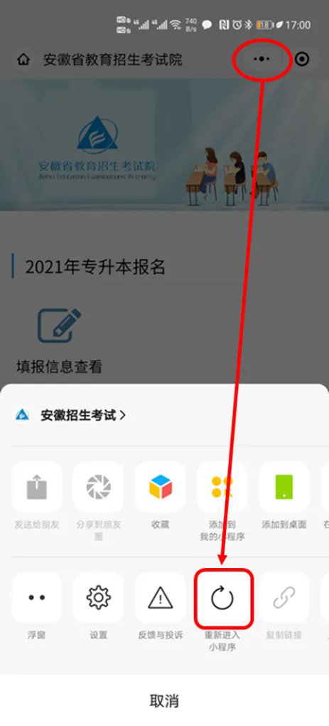 如果进入微信小程序看不到填报的信息,请点击界面右上角三个小点,在弹出的界面中选择“重新进入小程序”。6.缴费