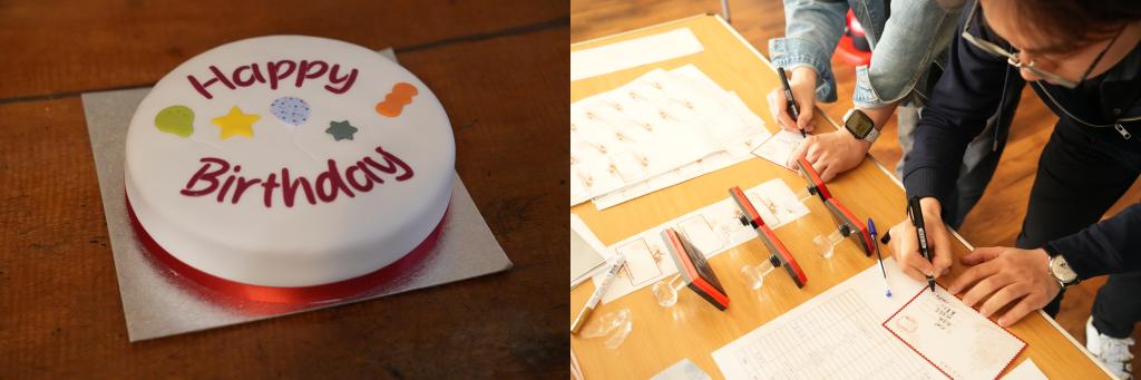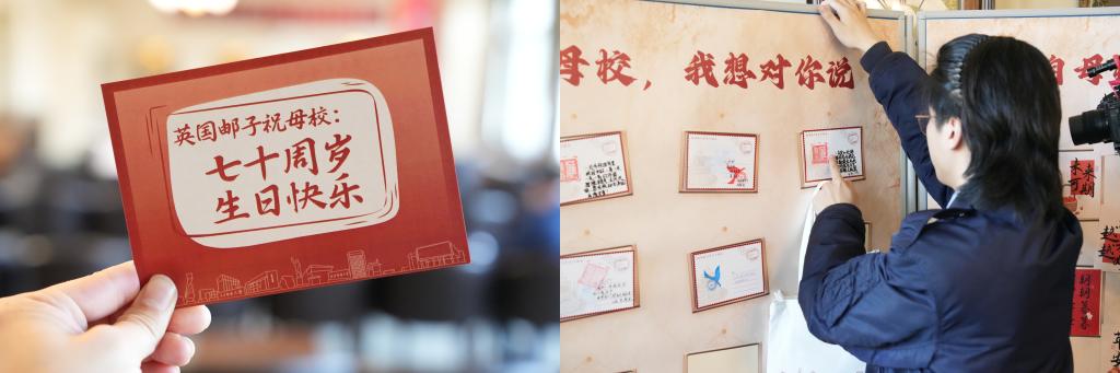 签到预热区,英国邮子在定制明信片上写下对母校的祝福并粘贴在展板上,盖有70周年校庆纪念章的母校师生手写祝福卡和校园文创盲盒也承载着母校的牵挂漂洋过海送达邮子手中。