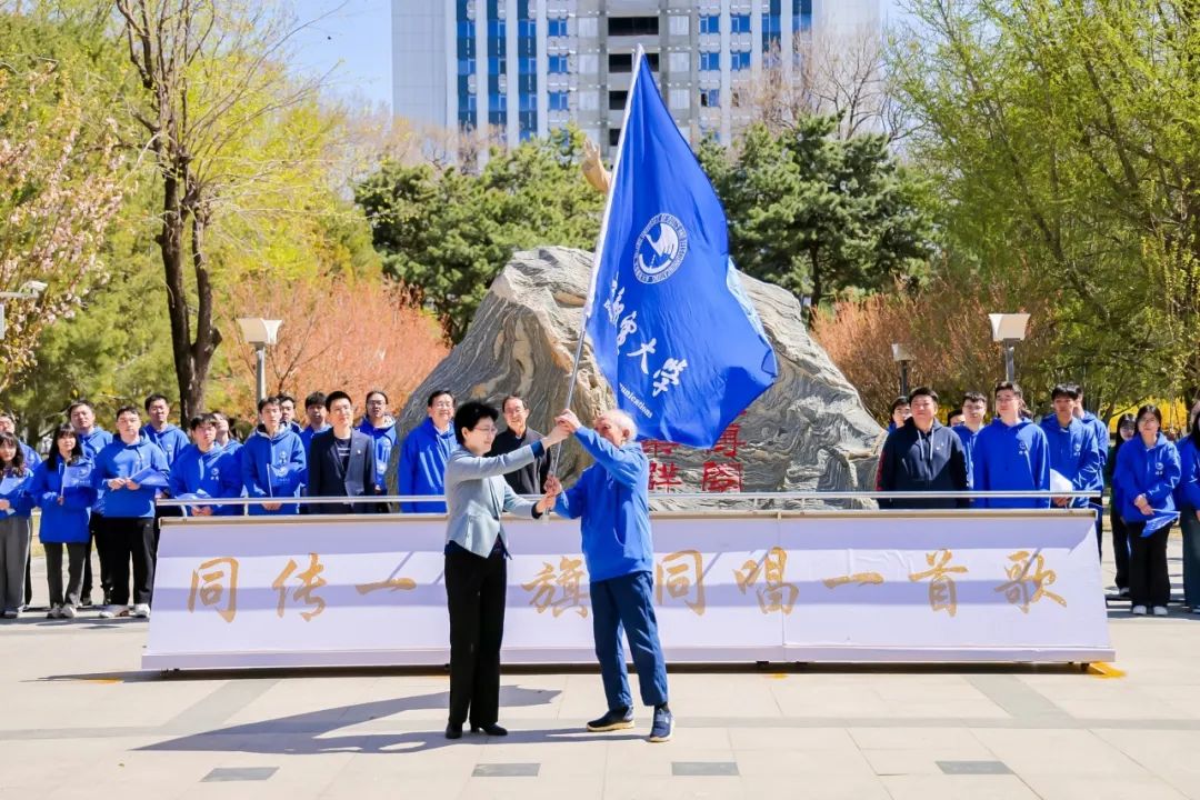 国护队员护送校旗庄严入场。续梅为校园时光跑首位旗手钟义信教授授旗。钟教授郑重接过校旗,挥动旗帜。马启华为校园时光跑鸣枪发令,正式宣告70周年校庆倒计时200天庆祝活动启动。