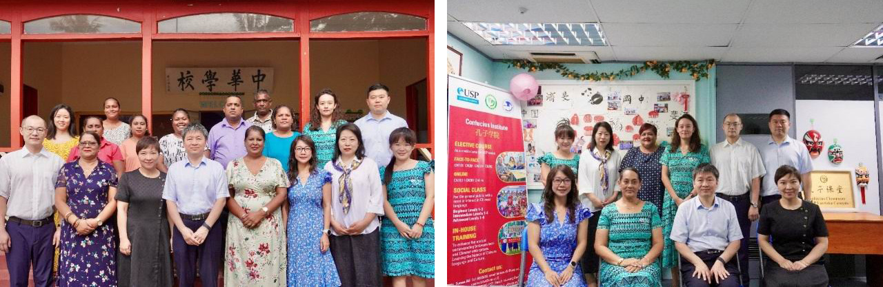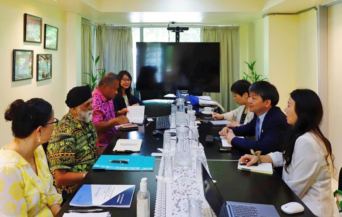 在劳托卡中华学校,苏森一行考察了学校的基础设施和国际中文教育现状和教学特色。随后,代表团到访南太平洋大学孔子学院劳托卡孔子课堂,苏森慰问课堂的两位公派教师并与南太大学劳托卡校区主管普拉米勒·戴维博士进行了亲切会晤。