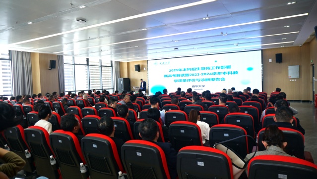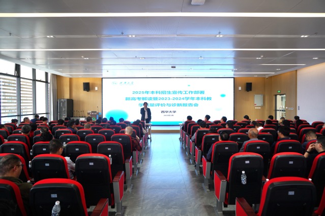 3月26日,西华大学在五食堂401报告厅召开2025年本科招生宣传工作部署、新高考政策解读暨本科教学质量评价与诊断报告专题会议。会议聚焦四川省2025年新高考改革政策、招生宣传策略优化及人才培养质量提升等议题,为学校应对高考改革新形势谋篇布局。副校长费凌、相关职能部门负责人、各学院党政负责人及专业系主任等百余人参会,会议由招生与就业处处长杨洪主持。