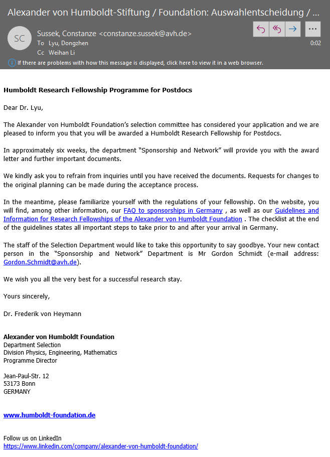 近年来,温州市委市政府高度重视人才和科技创新工作,持续实施战略人才引育与人才体制机制改革。温州大学机电工程学院高度重视青年教师培养,积极提供丰富的学术资源、搭建国际合作交流平台,助力成长与发展。吕东祯博士成功申请到洪堡基金资助是学院人才培养工作的阶段性成果。