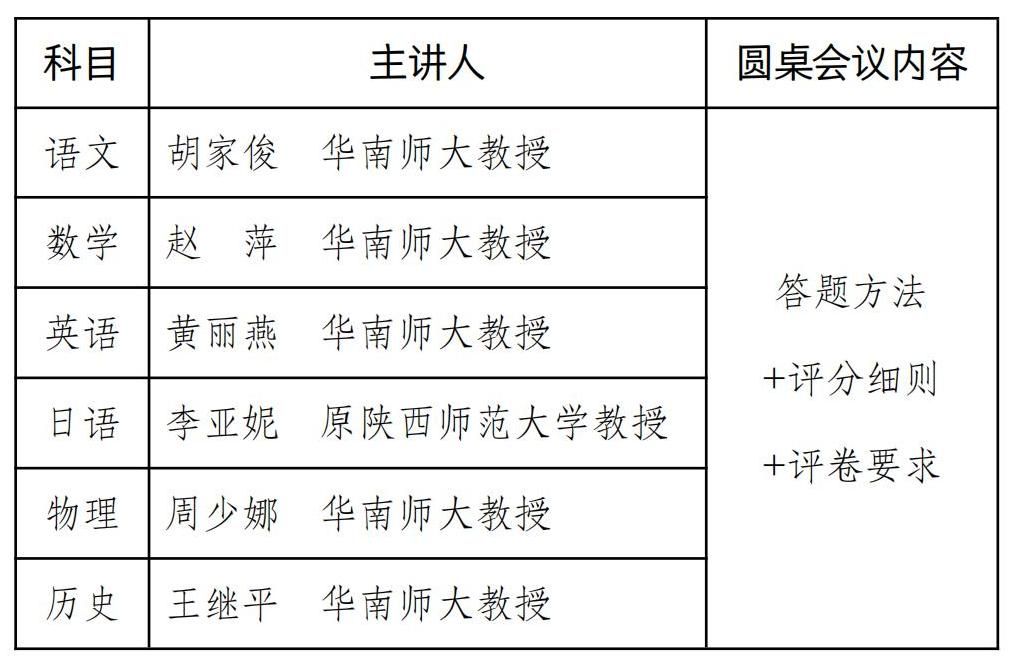 会议包括主题报告、圆桌论坛等形式,圆桌论坛拟分5个科类:语、数、英(日)、物、史,邀请省内资深高考专家作为圆桌论坛主讲嘉宾,同步进行。圆桌论坛嘉宾名单(初定)如下:
