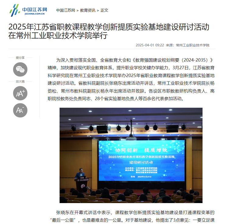 中国江苏网:2025年江苏省职教课程教学创新提质实验基地建设研讨活动在常州工业职业技术学院举行