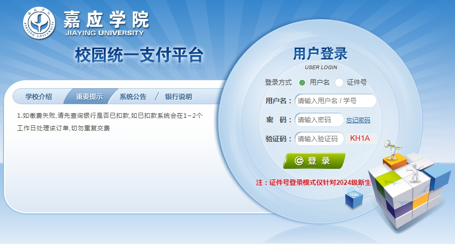 1.登录嘉应学院支付平台(https://pay.jyu.edu.cn),用户名为身份证号码,初始登陆密码为Jyu@证件号后6位(如证件号末尾为字母须大写)。