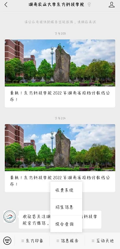 第一步:扫描下方二维码并关注“湖南农业大学东方科技学院”微信公众号。
