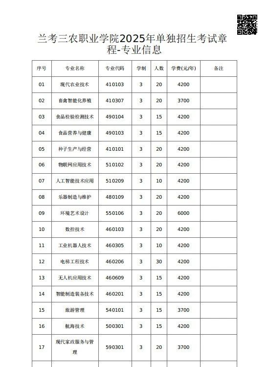 兰考三农职业学院2025年单招专业24个(详见附表),单招计划500人,所有专业学历层次为专科,学制三年。