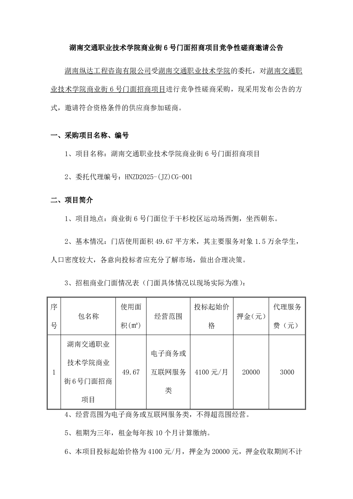湖南交通职业技术学院商业街 6 号门面招商项目竞争性磋商邀请公告