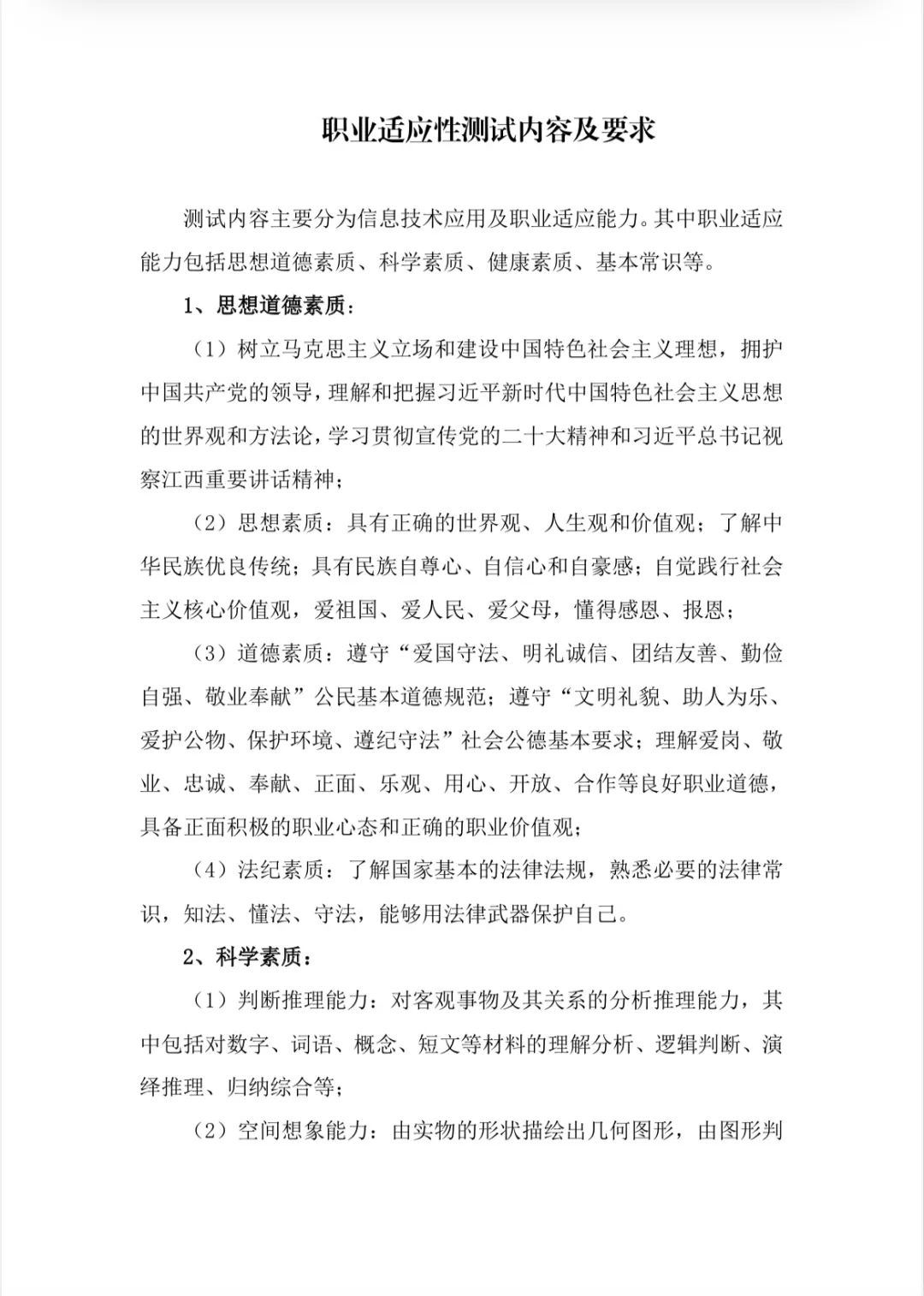 为了贯彻落实江西省教育厅《关于做好全省2025 年高等职业教育单独招生考试工作的通知》(赣教考字〔2024〕25号)的要求,江西航空职业技术学院2025年单独招生技能校考以职业适应性测试方式进行,为便于报考者充分了解测试的要求与范围,特制定本考试大纲。