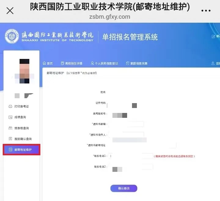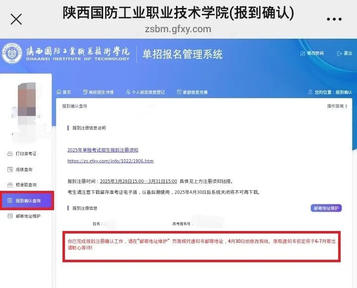 在办理完正式录取备案手续后,学校将在2025年6月中下旬邮寄录取通知书,若考生需要更改录取通知书邮寄地址,请于4月30日前登录我校单招考试报名系统,在“邮寄地址维护”界面内更改邮寄信息: