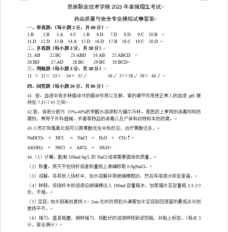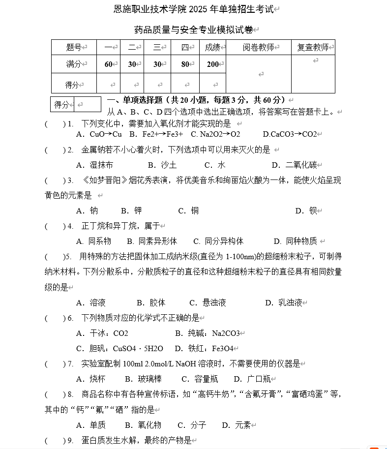 根据《省教育厅关于做好2025年高职院校单独考试招生工作的通知》(鄂教职成函〔2025〕3号),2025年湖北省普通高等学校招收中等职业学校毕业生单独招生考试药品质量与安全专业职业技能考试,是面向中等职业学校(包括中等专业学校、职业高中、技工学校和成人中专)相关专业毕业生的选拔性考试。药品质量与安全专业职业技能考试,要求融入中职毕业生就业岗位群实用技能,具有一定的信度、效度和必要的区分度。