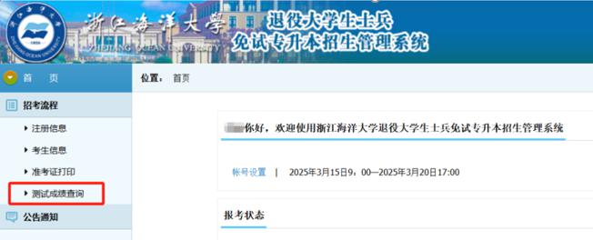 4.综合测试成绩查询:通过浙江海洋大学本科招生网,登录“免试专升本招生管理系统”(准考证打印的系统)后点击左边栏“测试成绩查询”进行查询,如下图所示: