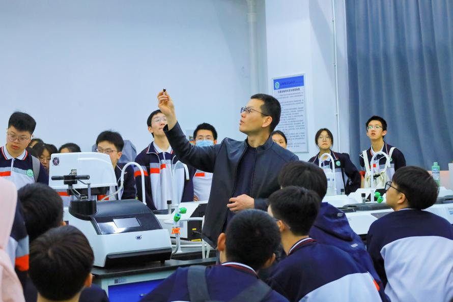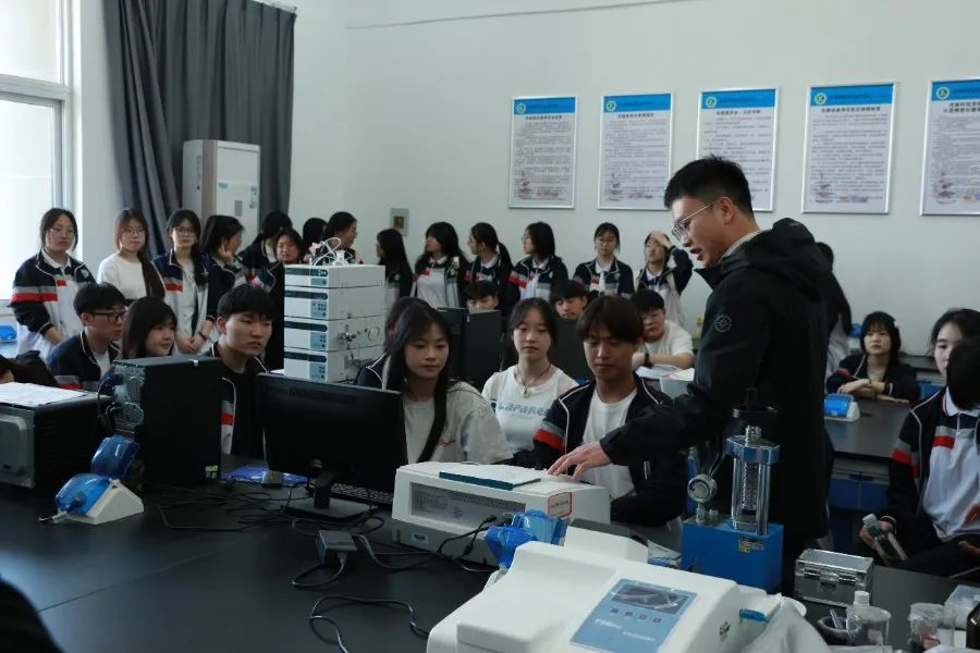 在生物工程学院,讲解老师向高中生们系统介绍了实验室和实验仪器的基本情况,首先是化学实验室里的离心机、反应釜、原子吸收光谱仪等仪器,使同学们直观理解了化工分离技术、反应原理及元素的鉴定方法。随后,师生们进入生物实验室,对智能生化分析仪、凝胶电泳仪、人体生理模型等生物实验仪器进行了基本认识,初步了解生命活动数据化背后的科研逻辑。同学们还观摩了学长学姐的实验操作过程,进一步加深了他们对科学研究的敬畏与向往。