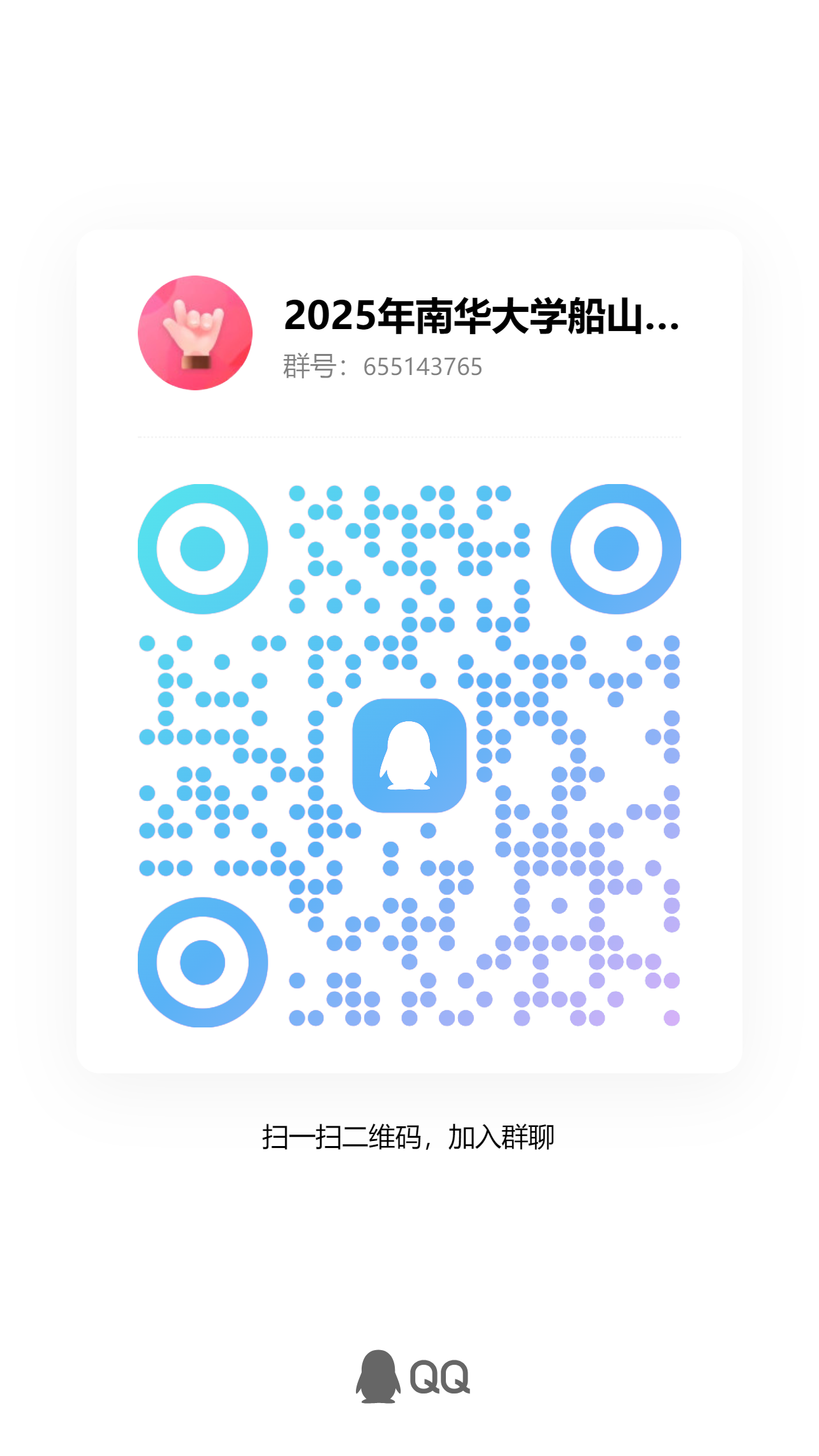 请考生尽快加入“2025年南华大学船山学院专升本免试生群”(QQ群号:655143765,群二维码如下图)。入群后,将昵称改为个人真实姓名,否则将被移出该群。