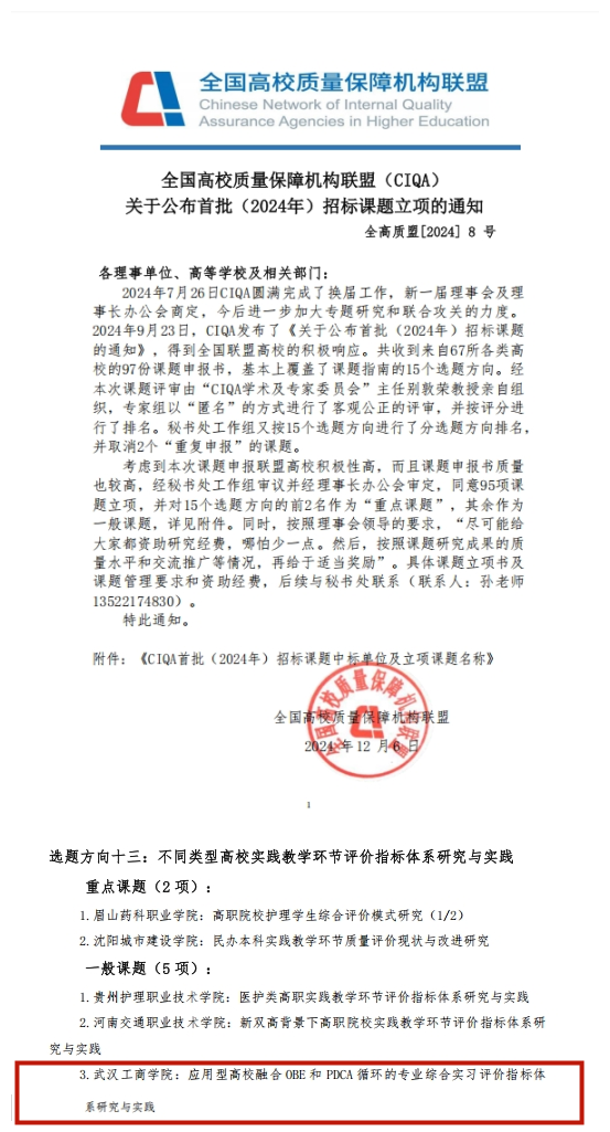 近日,全国高校质量保障机构联盟(CIQA)公布了首批(2024年)招标课题立项的名单。由武汉工商学院教学质量监测与评估中心副主任吕凯波主持申报的课题《应用型高校融合OBE和PDCA循环的专业综合实习评价指标体系研究与实践》获一般课题立项,学校成为湖北省同类高校中唯一获该课题立项的单位。