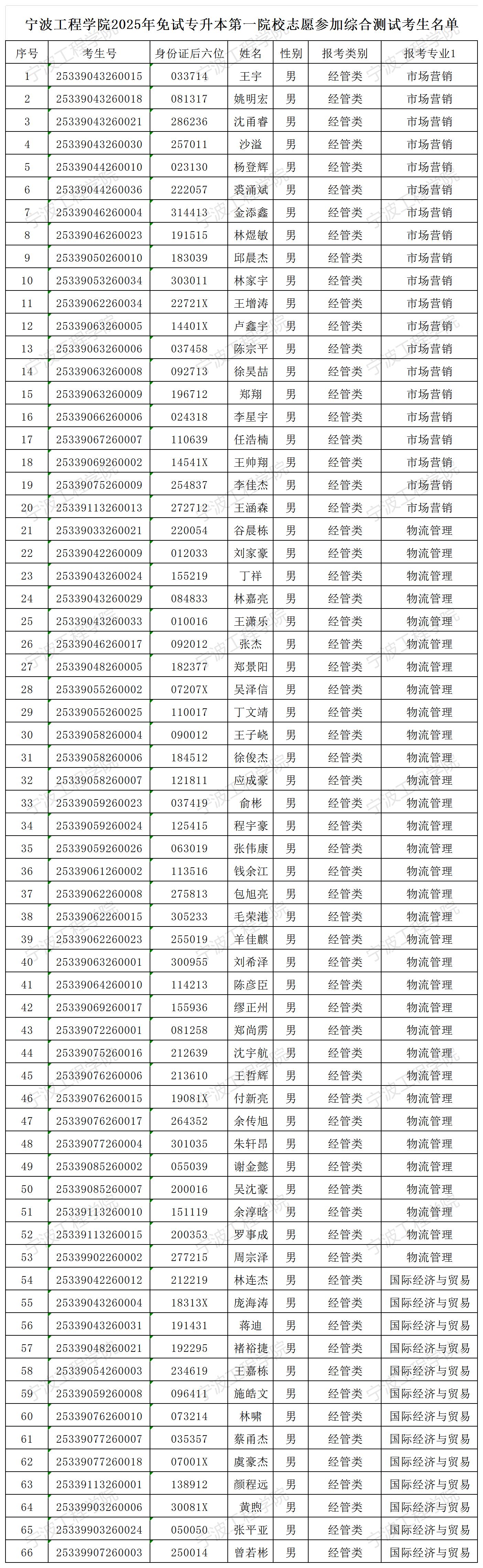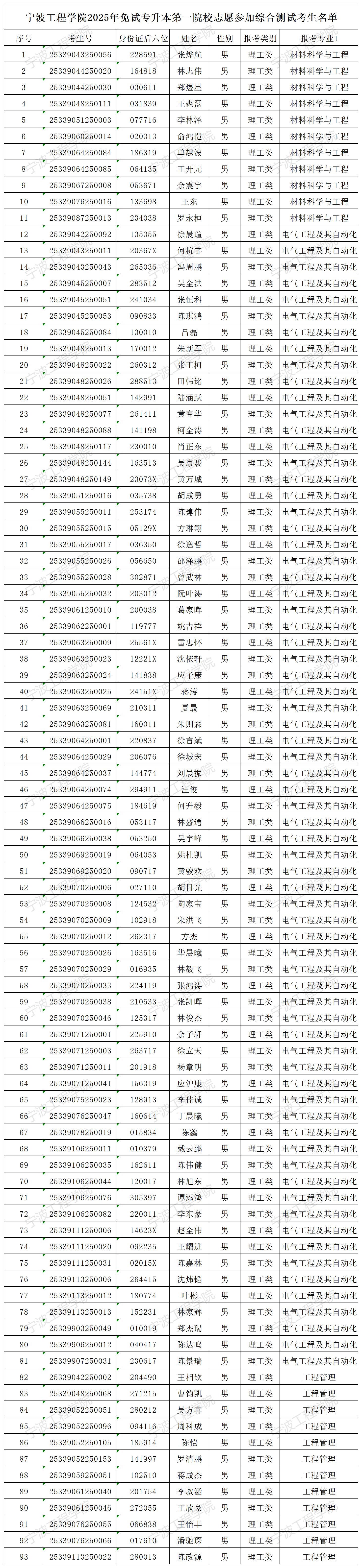 第一专业志愿报考理工类工程管理、电气工程及其自动化和材料科学与工程专业,经管类市场营销、国际经济与贸易和物流管理专业的人数超过招生计划数,根据《宁波工程学院2025年退役大学生士兵免试专升本招生简章》,考生需要参加本轮综合测试,未按要求参加我校测试的考生视为放弃报考资格,不能进入后续的录取环节。须参加综合测试的考生名单详见附件。