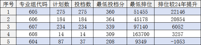 1.2025年学考投放计划794个,出档744人。普通类、中外合作办学等专业组全部满档出档,投档排位出现明显提升。各专业组投档情况如下: