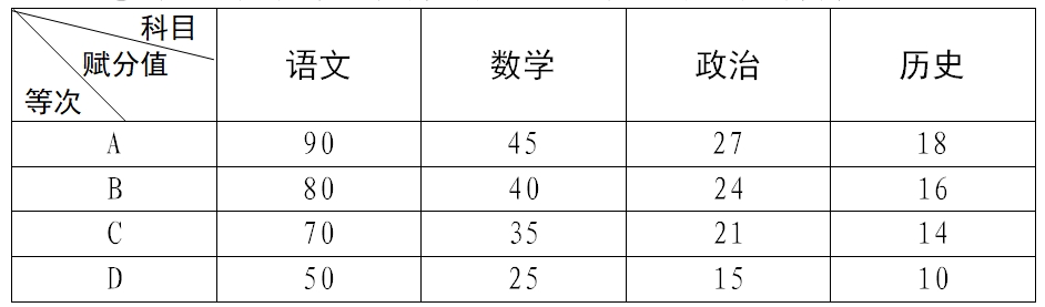 (1)有高中学业水平考试成绩等级的考生(高中生)原则采用省教育考试院提供的普通高中学业水平考试语文、数学、政治、历史四门科目成绩A-D或A-E等级及比例进行赋分折算;折算公式为:文化素质考试成绩=语文成绩+数学成绩+政治成绩+历史成绩。赋分标准如下: