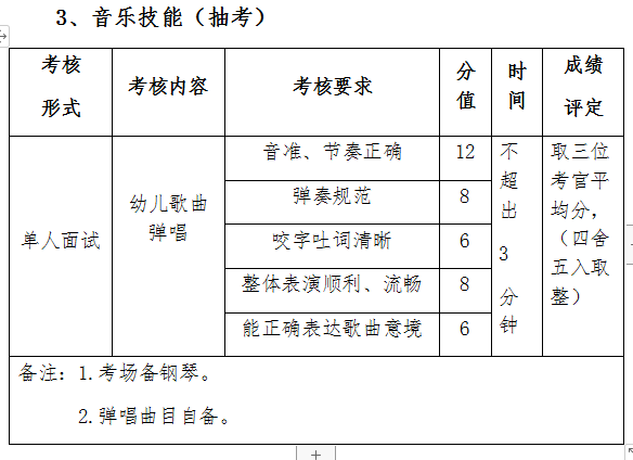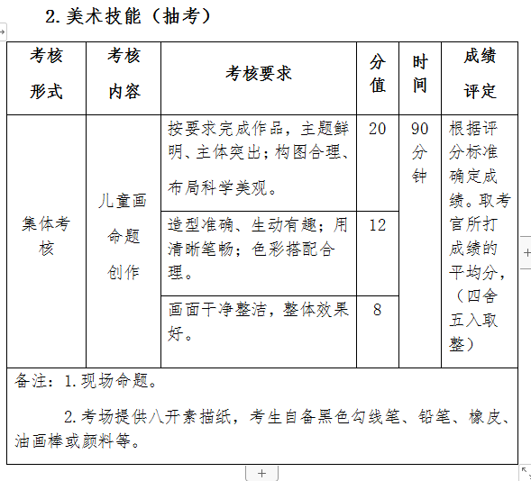 专业技能测试总分150分,测试方式为笔试+面试。笔试项目为专业理论知识测试(分值为50分);面试项目为专业技能测试(分值为100分)。专业技能测试为“1+1”,即必考1项+抽考1项:必考项目为幼儿故事讲述技能(分值为60分);抽考项目为美术技能、音乐技能、舞蹈技能,考生现场抽取其中一项进行测试(分值为40分)。