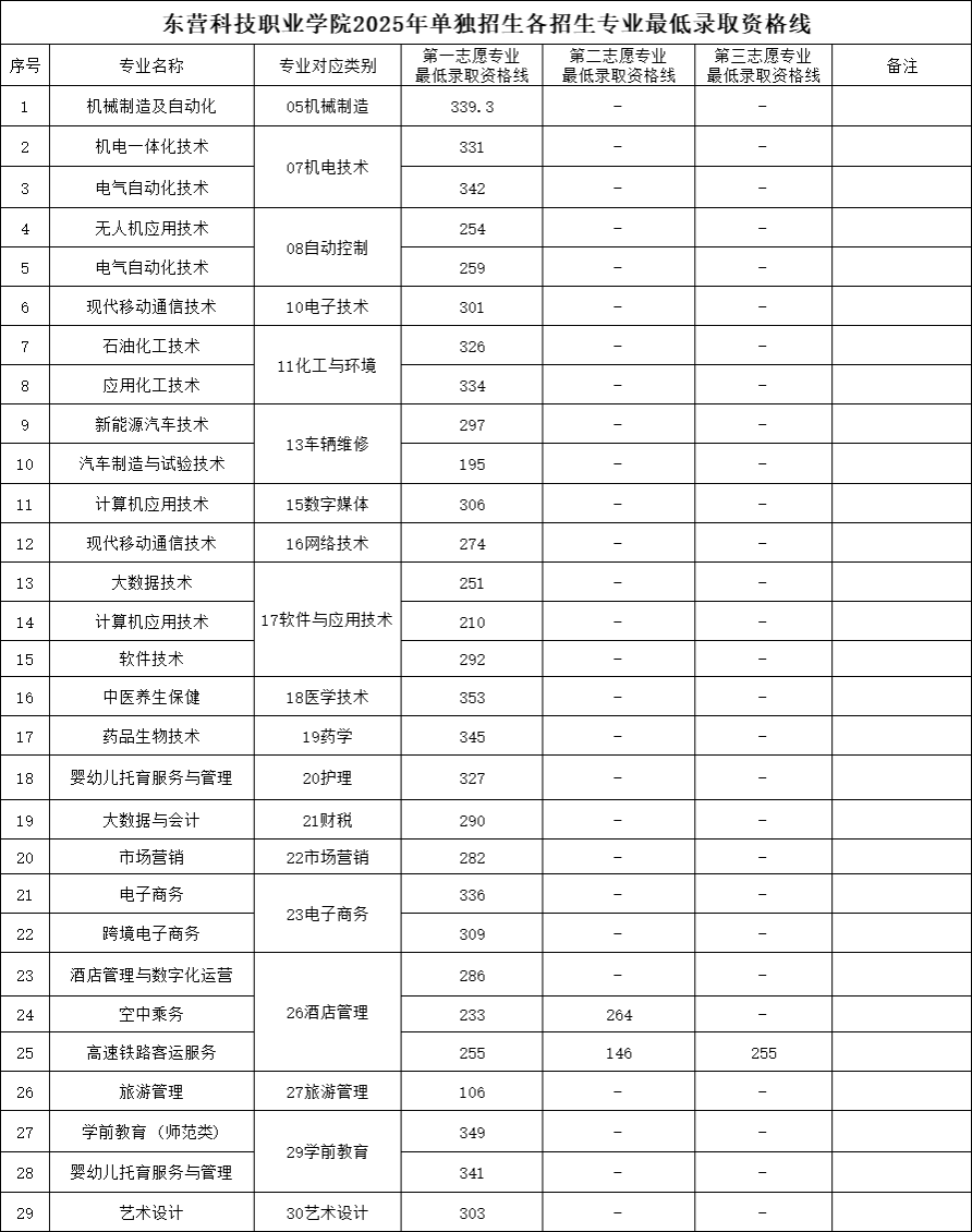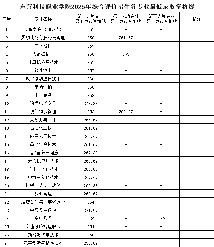 根据山东省教育厅《关于做好2025年高职(专科)单独考试招生和综合评价招生工作的通知》文件精神,按照《东营科技职业学院2025年高职(专科)单独招生和综合评价招生章程》规定,经学校招生考试工作领导小组研究,现将我校2025年单独招生及综合评价招生各批次、各专业最低录取资格线予以公示。 公示时间为三天(4月2日-4日下午17:00)。如有异议,请于公示期内向我校招生处反映。问题反馈电话:0546-6876888/0546-6883181(时间:8:30-11:20,14:30-17:00)。公示结束后,学校按要求向山东省教育招生考试院报送拟录取名单,办理正式录取手续。 考生拟录取结果查询预计于2025年4月2日-4月8日进行,届时考生可登入学校首页“单独招生、综合评价招生系统”漂浮窗口或搜索网址:http://dykjdz.sdyunxiang.cn/输入考生号及身份证号后六位进行查询。 依据国家教育部、山东省教育厅规定,已被我校单独招生、综合评价录取的考生,与普通高校春季、夏季高考录取新生享受相同的待遇。考生录取后,一律不再参加2025年普通高校春季、夏季统考及录取。此次未被我校单独招生、综合评价招生录取的考生可继续参加春季高考或夏季高考。 未被录取的考生请尽快调整心态,全力准备高考,仍然可以根据春季高考或夏季高考成绩再次填报我校统招志愿。 2025年单独招生及综合评价招生各批次、各专业最低录取资格线如下: