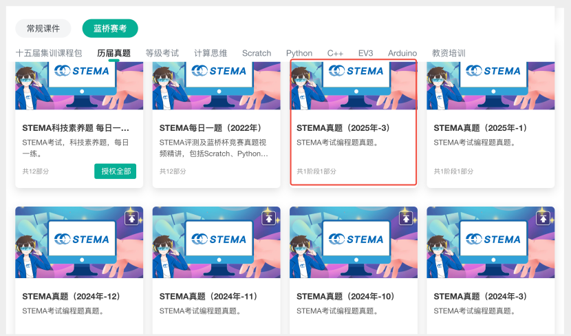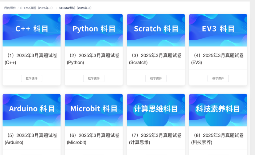 本次上线的3月STEMA考试真题,覆盖Scratch、Python、C++、计算思维、科技素养、Microbit、Arduino等科目。无论您的学生专注于编程学习还是科技知识储备的提升,在这里都能找到适配的题目,实现精准训练。