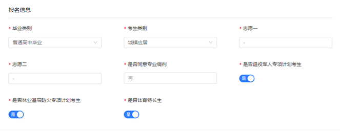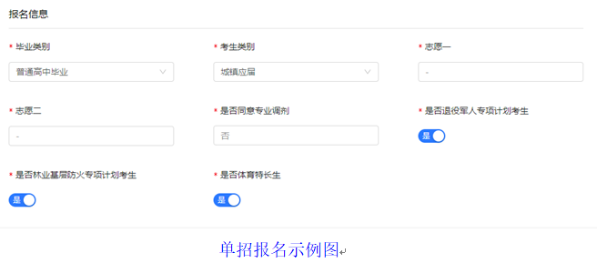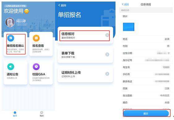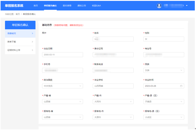 登录成功后,点击“单招报名确认”--“信息核对”按钮,按要求完成报名确认及信息完善。报考退役军人涉农园艺技术、花卉生产与花艺专业专项计划考生请选择是否为“退役军人专项计划考生”。报考森林草原防火技术专业专项计划考生请选择是否为“林业基层防火专项计划考生”,报考体育特长生的考生请选择是否为“体育特长生”。(请确认报名信息无误后提交!并进行报名登记表下载)