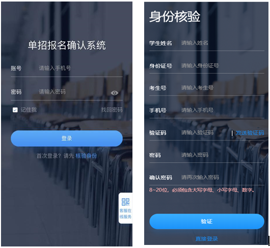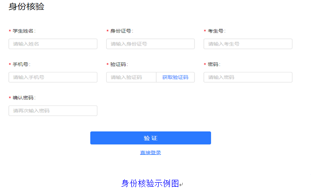 点击下方“核验身份”按要求使用“身份证号”、“考生号”等填写信息完成身份验证,注册成功后登录系统。(后续若密码忘记,请点击“找回密码”通过短信验证方式重置密码。)