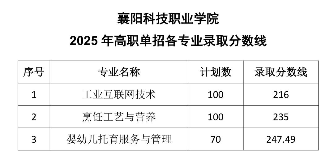 根据《湖北省教育厅关于做好2025年高职院校单独考试招生工作的通知》(鄂教职成函〔2025〕3号)和《襄阳科技职业学院2025年高职单独考试招生章程》要求,我校2025年高职单独招生各专业录取分数线和拟录取名单公示如下(详见附件),公示期7天(2025年4月4日—4月10日)。公示期内,如有异议,请向学校反映。