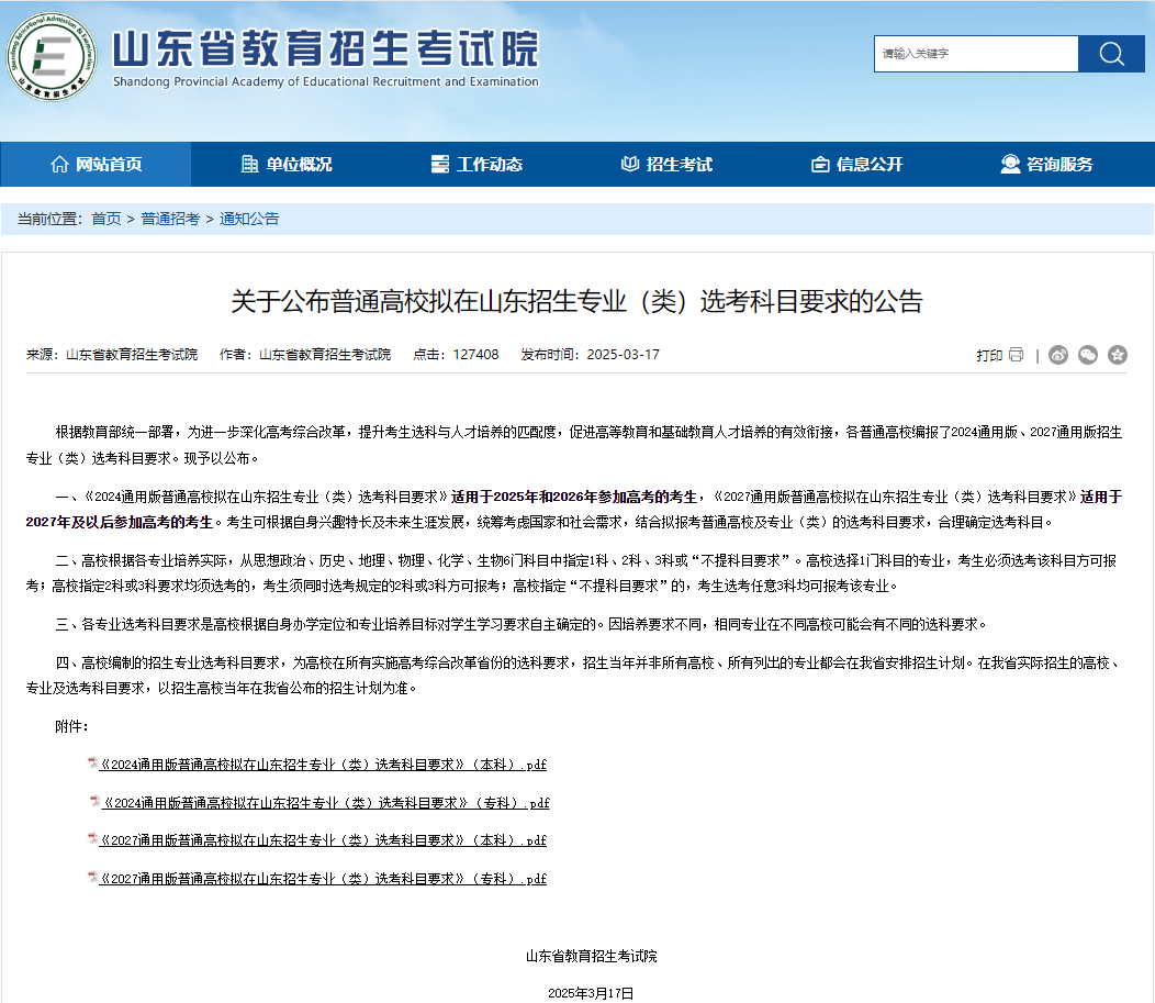 附件【2024通用版普通高校拟在山东招生专业(类)选考科目要求(本科)(适用于2025年和2026年参加高考的考生).pdf】已下载30次 附件【2027通用版普通高校拟在山东招生专业(类)选考科目要求(本科)(适用于2027年及以后参加高考的考生).pdf】已下载7次