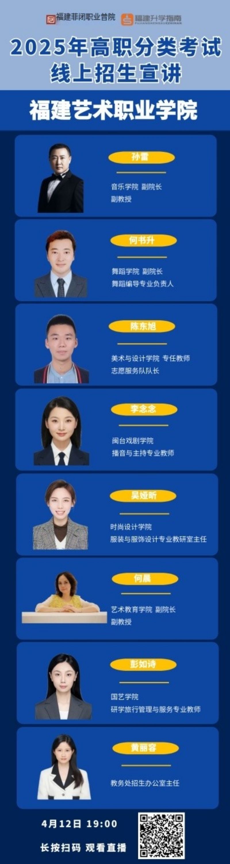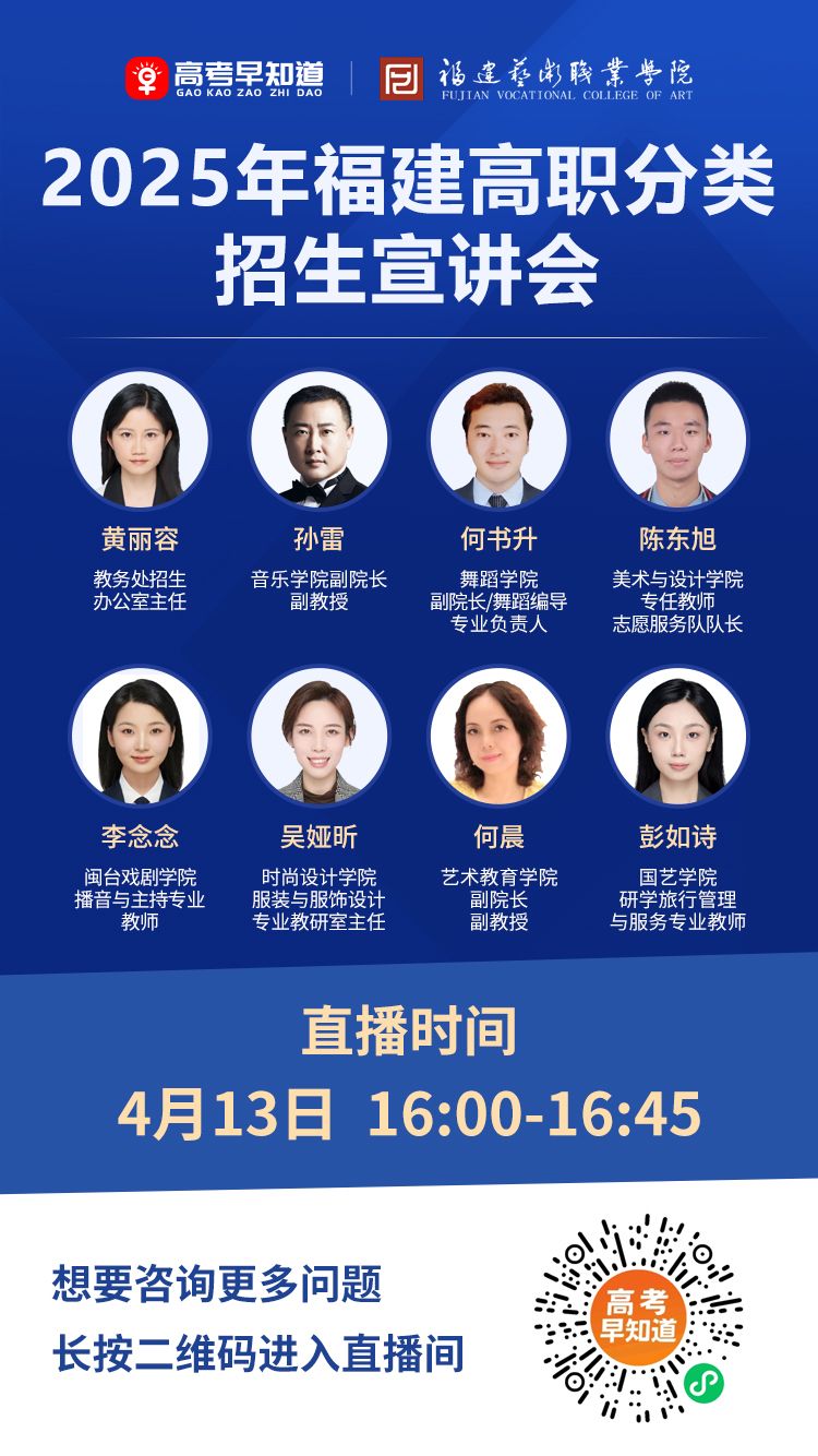4月12日、13日,学校招生办携手各二级学院在福建升学指南、福建高考早知道平台,开展2025年高职分类招生宣讲会。具体直播时间、直播间地址详见海报。