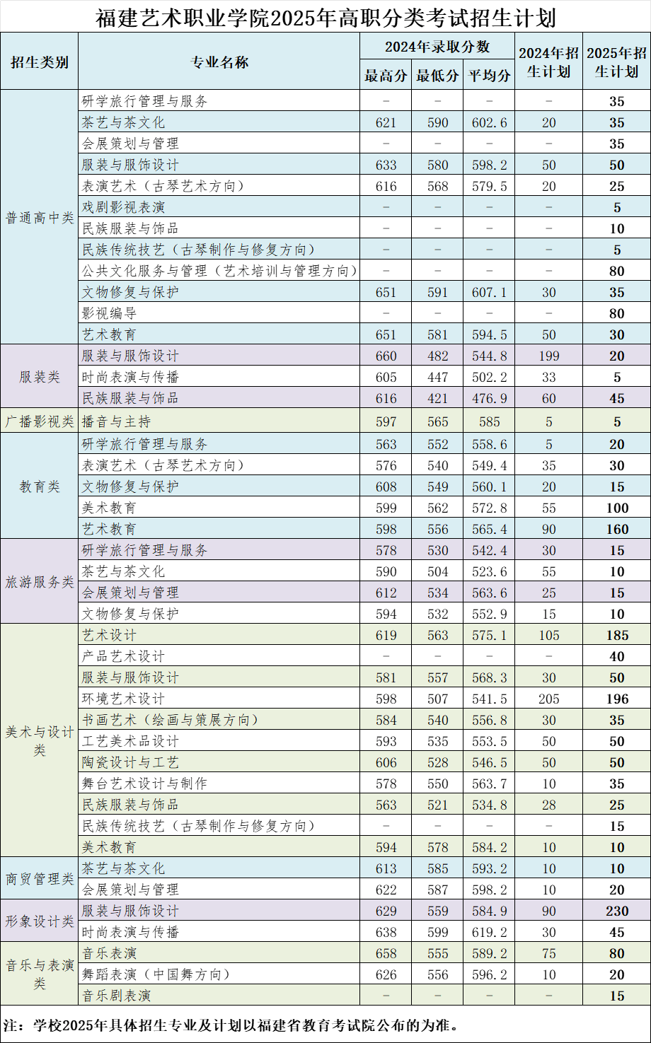 福建艺术职业学院2025年高职院校分类考试招收普通高中类、服装类、广播影视类、教育类、旅游服务类、美术与设计类、商贸管理类、形象设计类、音乐与表演类等考生,招生计划1986人。欢迎各位考生踊跃报考!