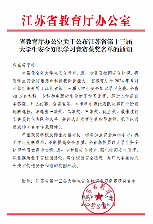 近日,由省教育厅主办的江苏省第十三届大学生安全知识竞赛落下帷幕,我校卞鸿月、施婧怡、顾俊奕、孙浩晨等4名同学组成的代表队荣获本科组三等奖(全省共14所本科院校获三等以上奖项)。