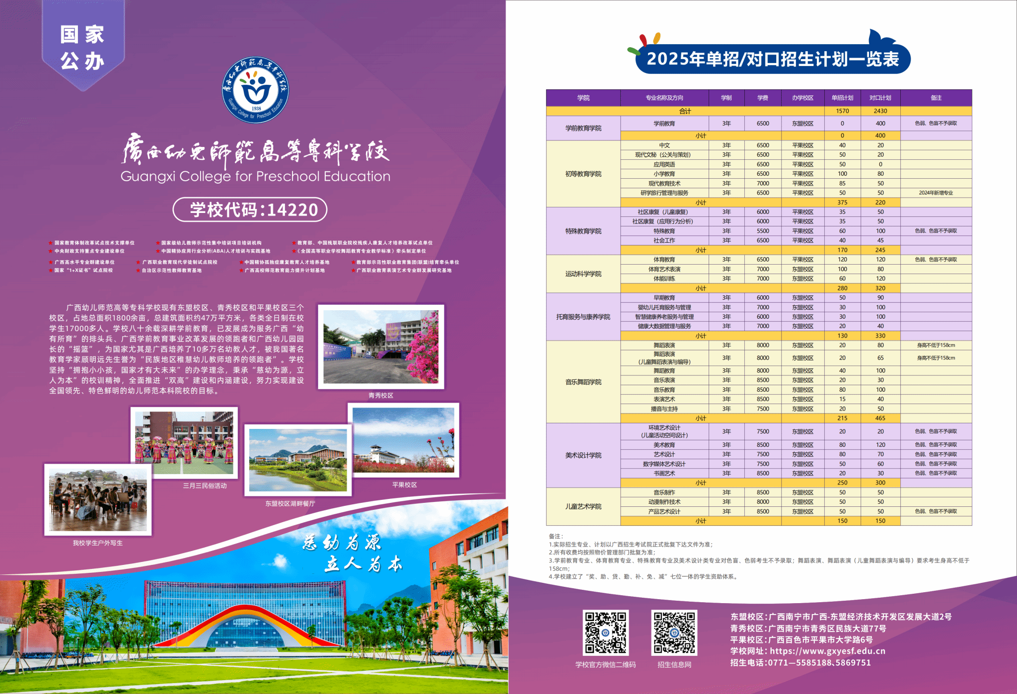 广西幼儿师范高等专科学校2025年单招/对口招生计划一览表