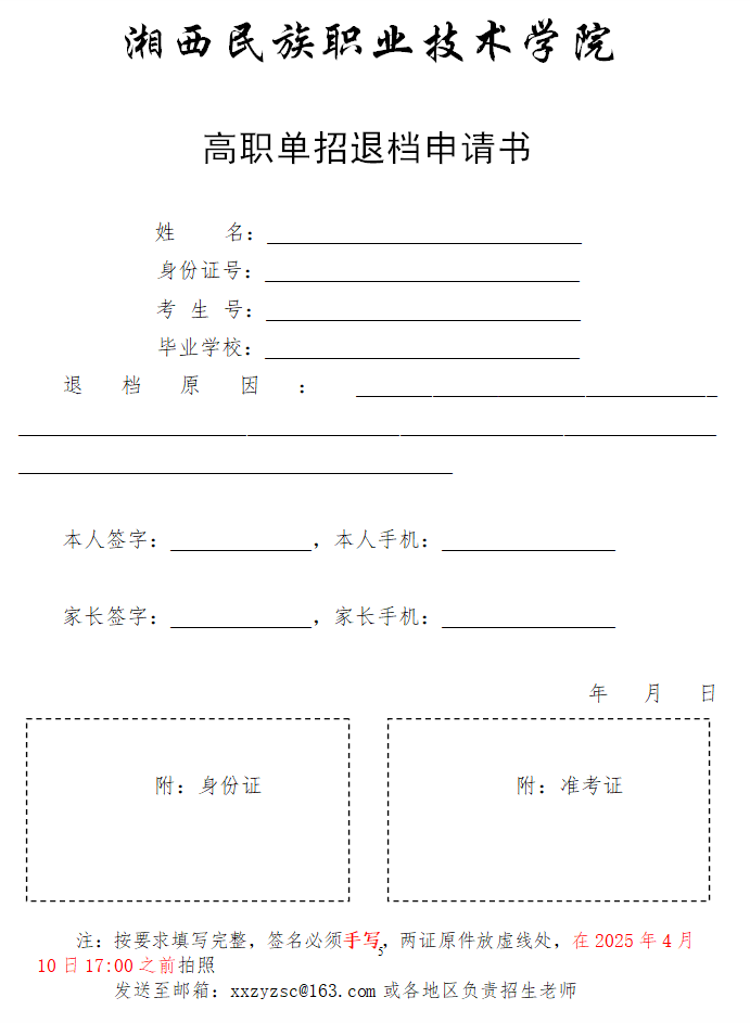 根据湖南省教育厅、湖南省教育考试院《关于做好我省2025年高职院校单独招生工作具体事项的通知》和《湘西民族职业技术学院2025年高职单招章程》的要求,我校按照“分数优先”的原则对参加我校2025年单招二志愿考试考生进行预录取,请考生点击湘西民族职业技术学院招生网首页下方“录取查询”,查询考生本人录取状态。放弃预录取资格的考生须手写《湘西民族职业技术学院单招退档申请书》(见附件),并于2025年4月10日下午17:00前将手写退档申请书扫描或拍照发送至我校招生就业处邮箱xxzyzsc@163.com,邮件主题为: