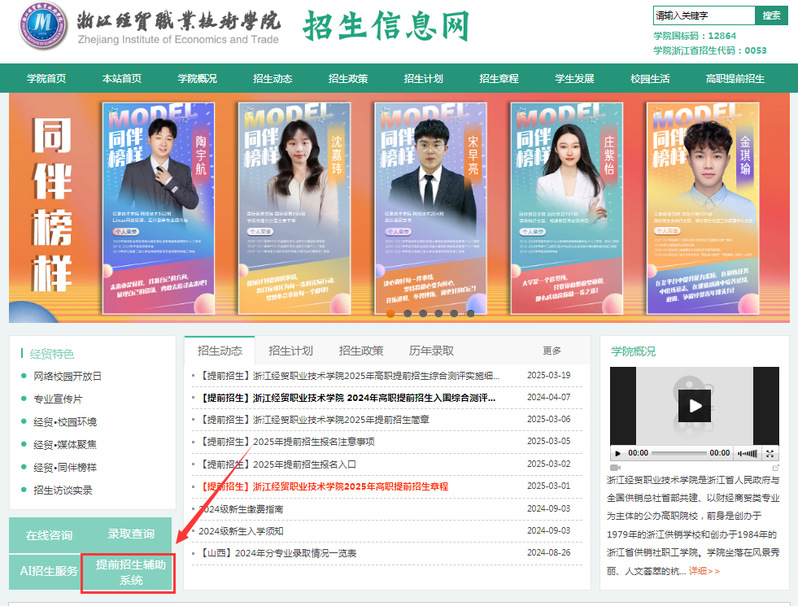 第一步,登录浙江经贸职业技术学院招生信息网(http://zs.zjiet.edu.cn),点击“提前招生辅助系统”。