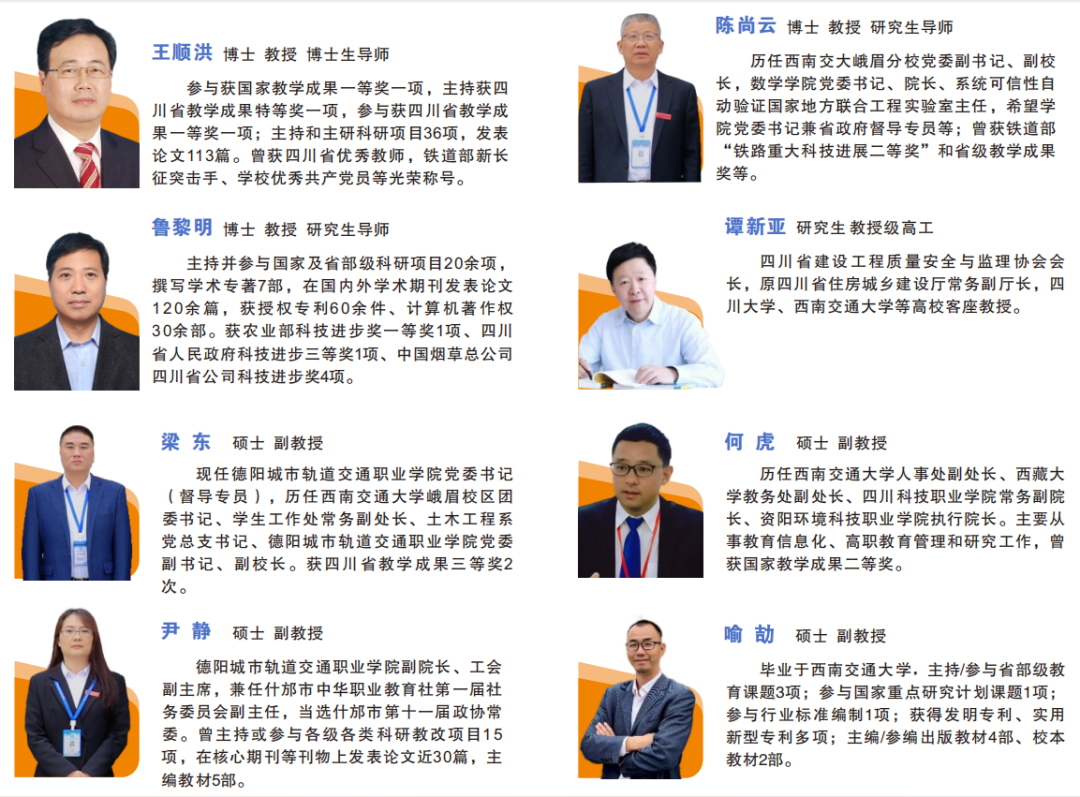 我校师资力量雄厚,现有专兼职教师近500名。来自企业生产一线的行业导师47人,硕士及以上专任教师160人,取得中级及以上职称专任教师120人,“双师型”教师占比近50%。其中不仅有来自西南交通大学的专家教授,亦有来自企业生产一线的高级管理人员和工程师。学校师资团队包括西南交通大学专家团队、通识教育专家团队、双师型专家团队、特聘专家讲授团队和企业专家团队。