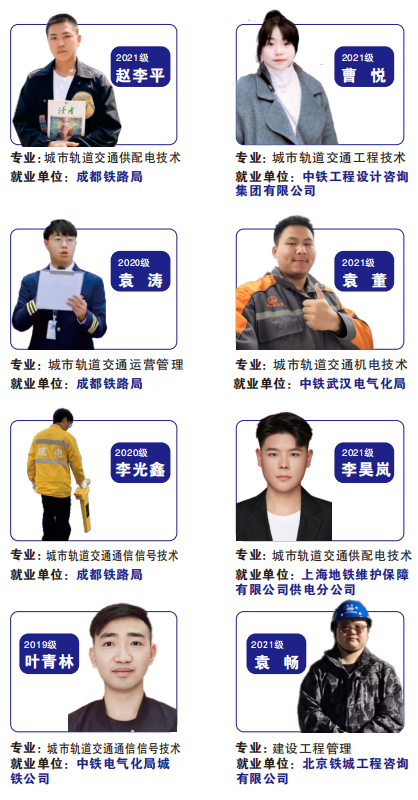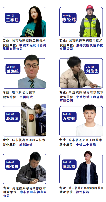 依托人才培养质量和轨道交通行业特色优势,我校毕业生已获成都铁路局、中国中铁、中国铁建、中国中车、中国交建、天津地铁等众多国企央企单位的认可和青睐,每年均在我校进行专场招聘。此外,针对重点人群就业,学校进行了一人一岗定点精准推荐,建立台账,保障充分就业。近年来,为毕业生提供求职创业补贴、就业困难帮扶补贴。