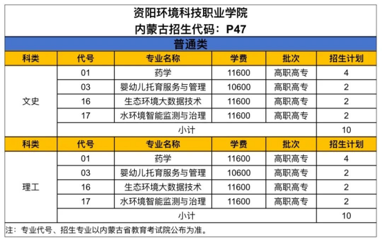 2024年资阳环境科技职业学院内蒙古招生计划出炉!