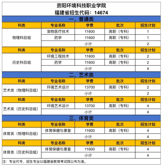 2024年资阳环境科技职业学院福建省招生计划出炉!