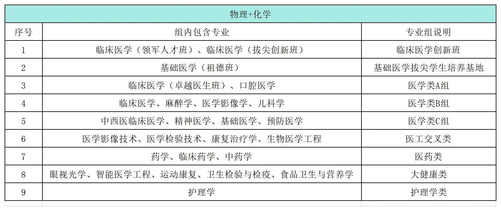 2025年四川高考综合改革适应性演练普通类招生“物理+化学”设置9个专业组;“物理或历史+不限”设置4个专业组,具体分组如下: