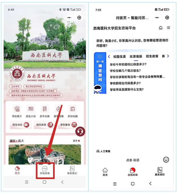 西南医科大学智能招生问答系统已接入DeepSeek大模型,各位考生及家长可通过西南医科大学本科招生官网、本科招生小程序两种方式进行在线咨询。