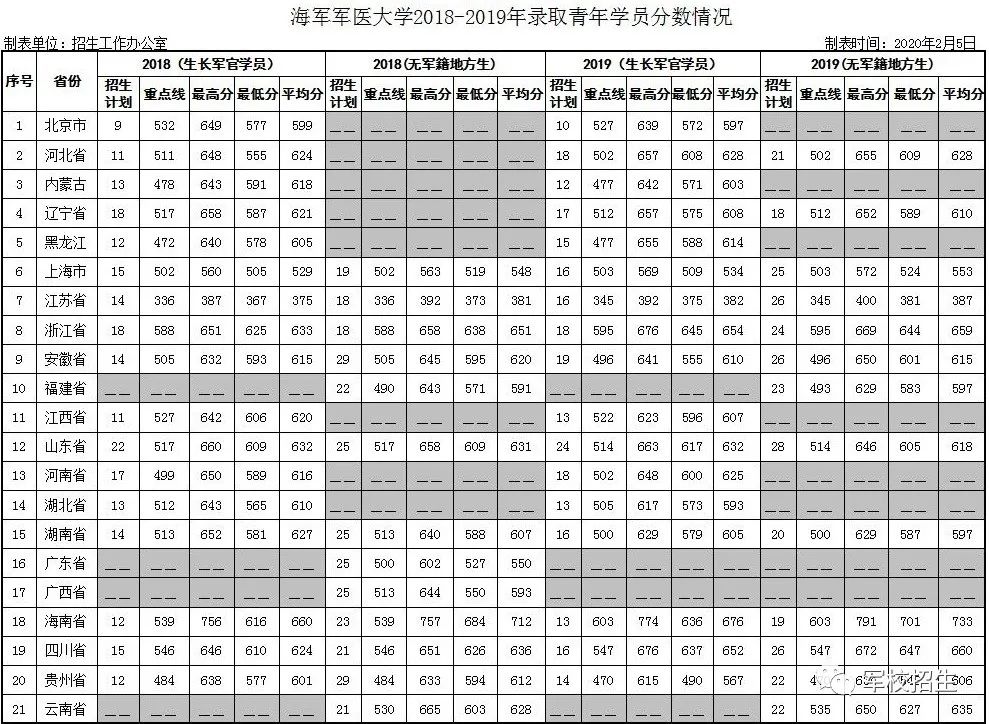 学校现为国家“双一流”重点学科建设院校、国家“211工程”重点建设院校、军队“双重”重点学科建设院校,是36个“国家生命科学与技术人才培养基地”之一。学校设有全国唯一的中医学八年制专业,现有的海军医学系、卫生勤务学系、中医系、麻醉系均为全军唯一的专业系。学校作为医学院校,招生专业齐全,面向普通地方高中生共开设13个专业,包括临床医学、中医学2个八年制专业,临床医学、中医学、麻醉学、精神医学、医学影像学、预防医学等6个五年制专业,生物技术、药学、中药学、护理学、公共事业管理等5个四年制专业。