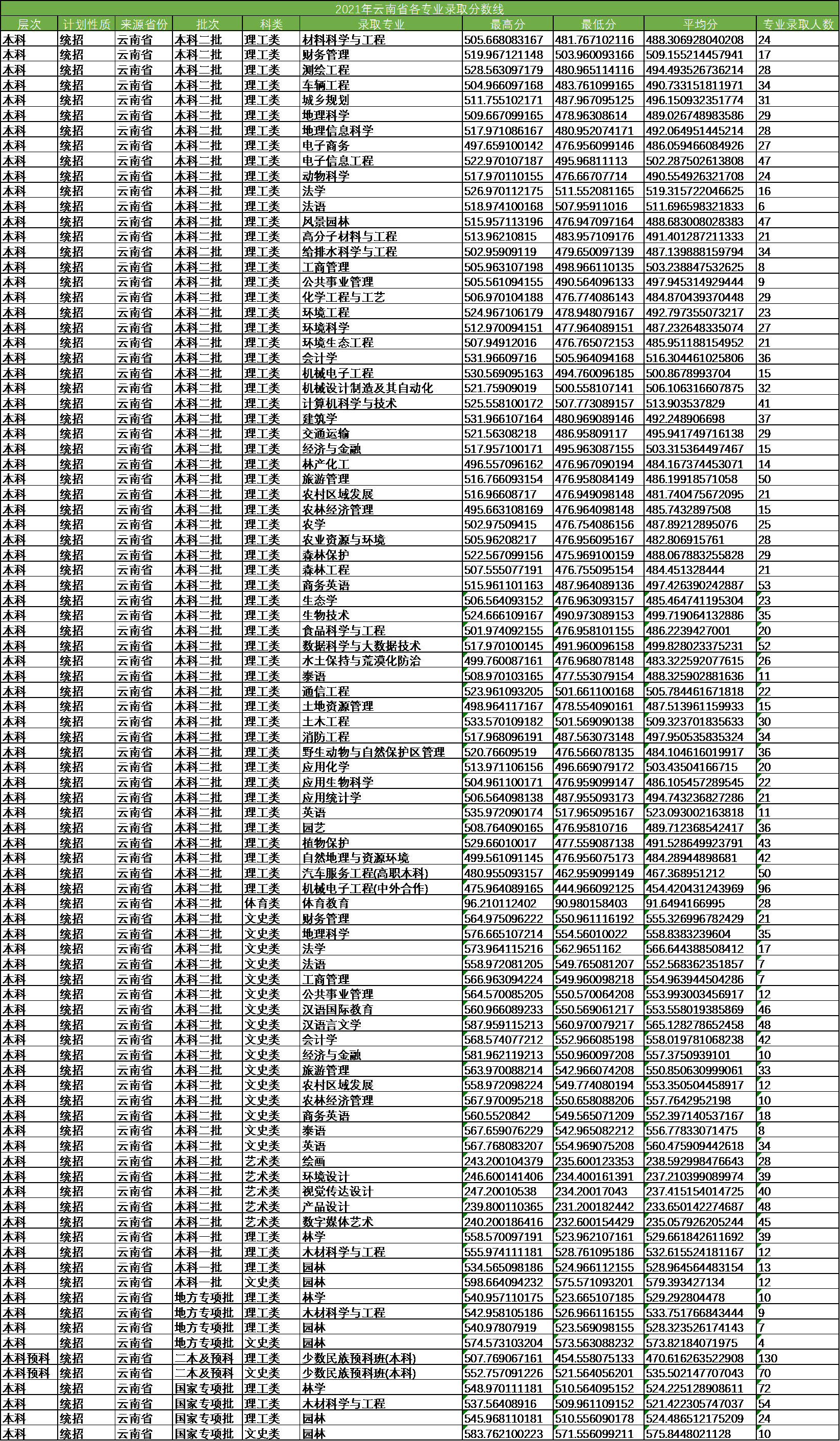 2021年云南省各专业录取分数线