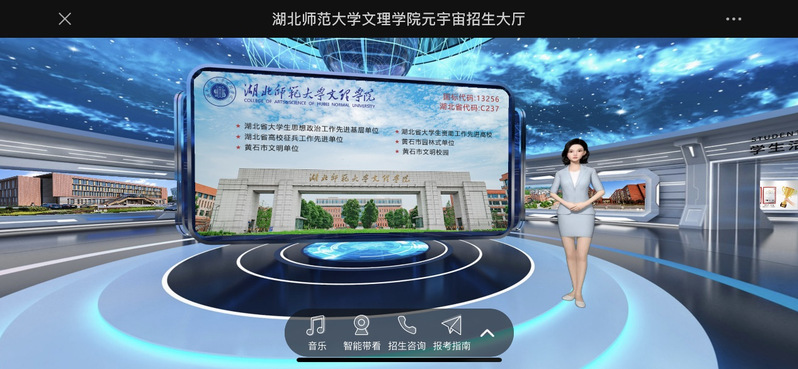 湖北师范大学文理学院元宇宙招生大厅是基于元宇宙技术(虚拟现实、数字孪生、三维建模、人工智能等)打造的数字化3D招生大厅,考生和家长可以在大厅内身临其境全方位了解学校,同时大厅内还有3D数字老师为大家介绍学校哦!