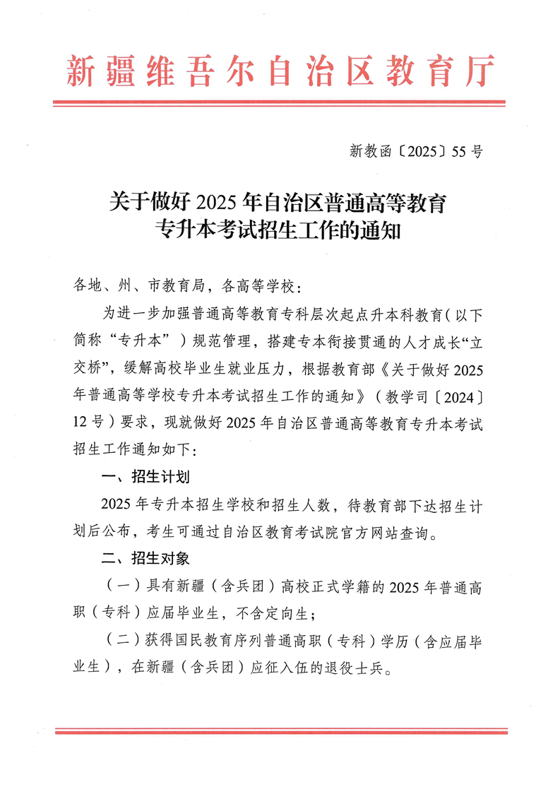 关于做好2025年自治区普通高等教育专升本考试招生工作的通知