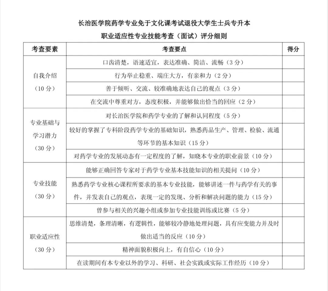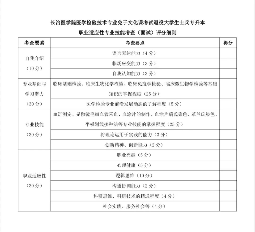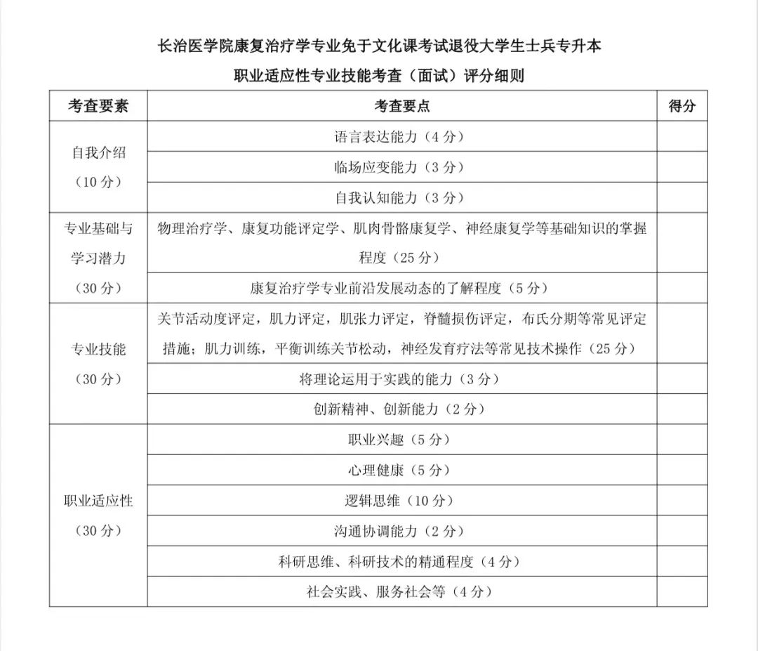 根据《长治医学院2025年专升本免试入学及退役大学生士兵免于文化课考试招生工作方案》,我校免于文化课考试退役大学生士兵职业技能综合考查由原专科学习期间成绩(主干课成绩)占比40%、职业适应性专业技能考查(面试)成绩占比30%、服兵役期间表现占比30%,三部分进行百分制加权,形成考生综合考查成绩。具体考查细则及评分标准如下: